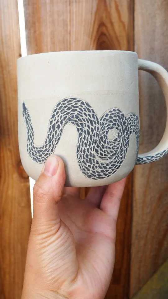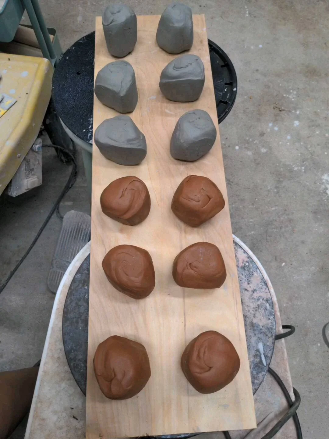 Stack of speckled ceramic mugs and bowls on a wooden shelf