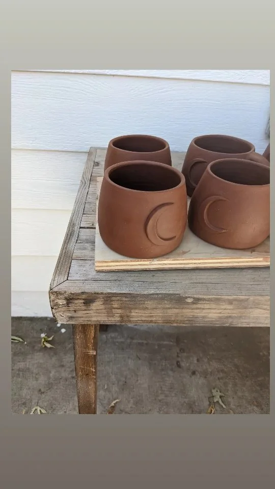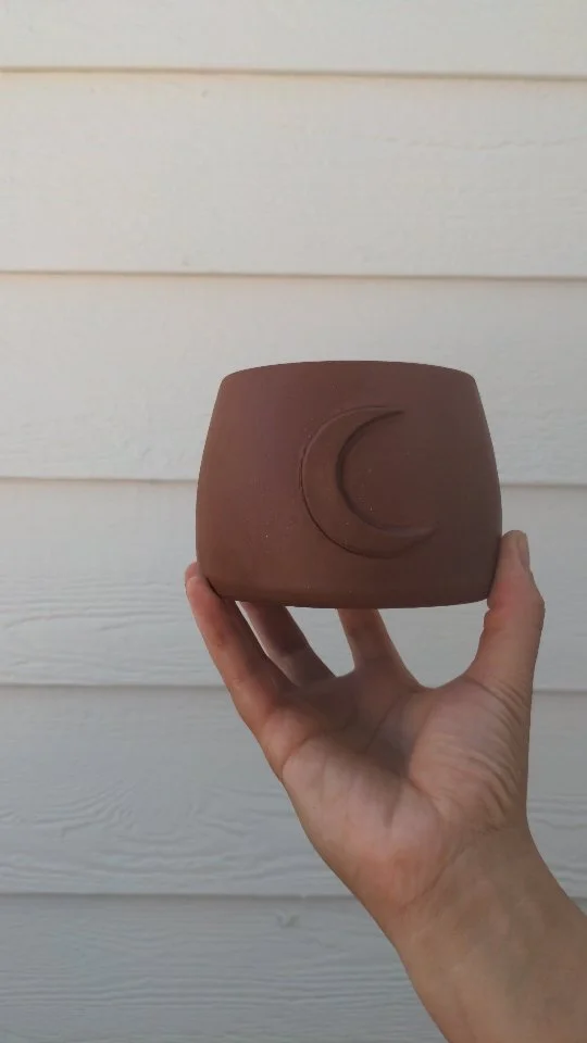 Two ceramic display holders; the left one contains a crystal cluster, a small stone pyramid, a piece of wood, and a golden crescent moon. The right one has three compartments, each with a small stone.