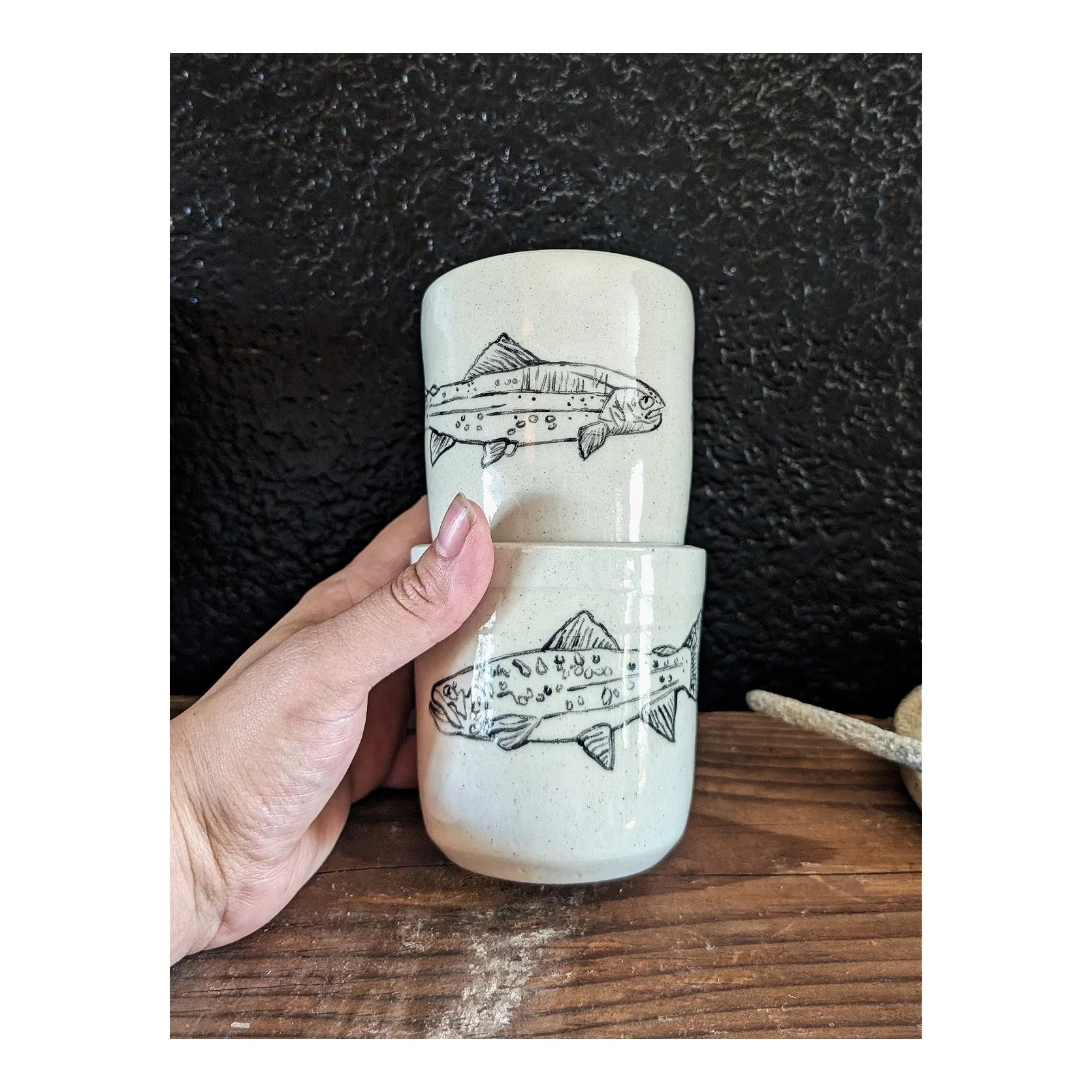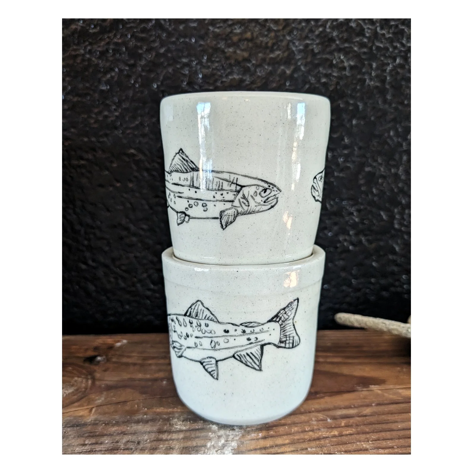 Image 1 of 2 Image 2 of 2 Trout Cup $38.00 Only 2 left in stock Hand-painted original artwork by Akela Hudson Rainbow and Brook TroutApproximately 3”Dia x 3” H about 9 oz. Add To Cart Added! Hand-painted original artwork by Akela Hudson Rainbow and Brook TroutApproximately 3”Dia x 3” H about 9 oz.
